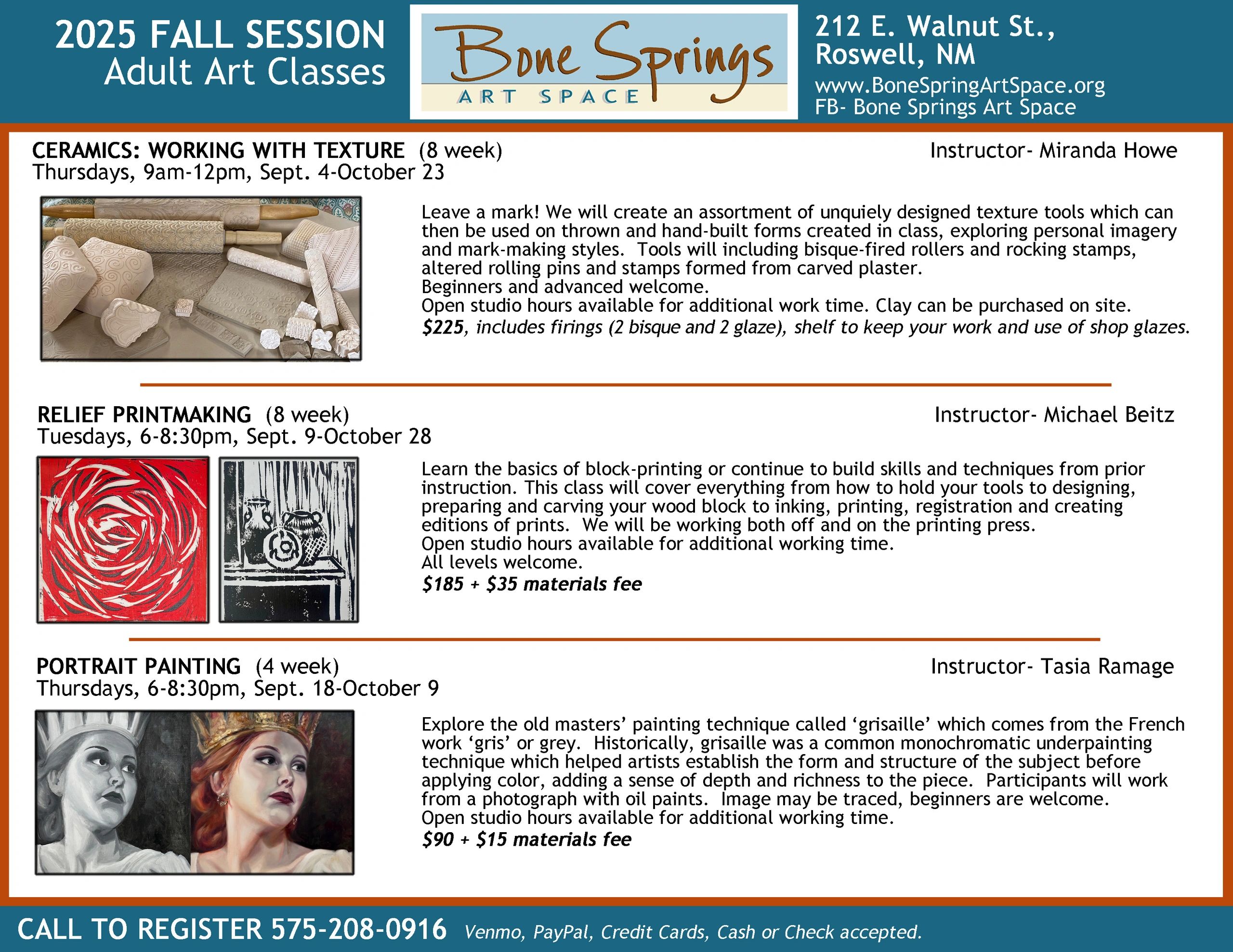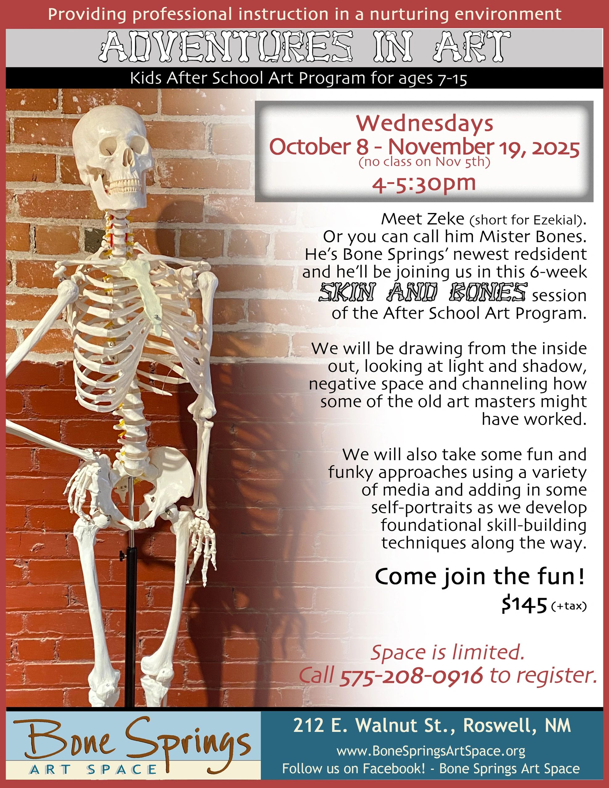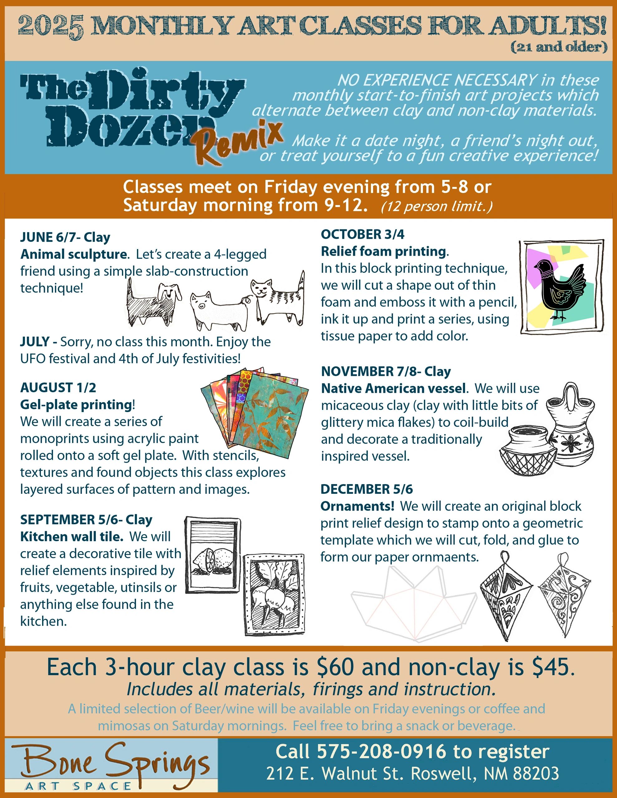 Bone Springs Art Space, housed in a renovated historic warehouse, provides a range of creative opportunities to the Roswell community through art classes, studio rentals, event space, gallery exhibitions and a gift shop highlighting the handmade- featuring the work of local and regional artists.