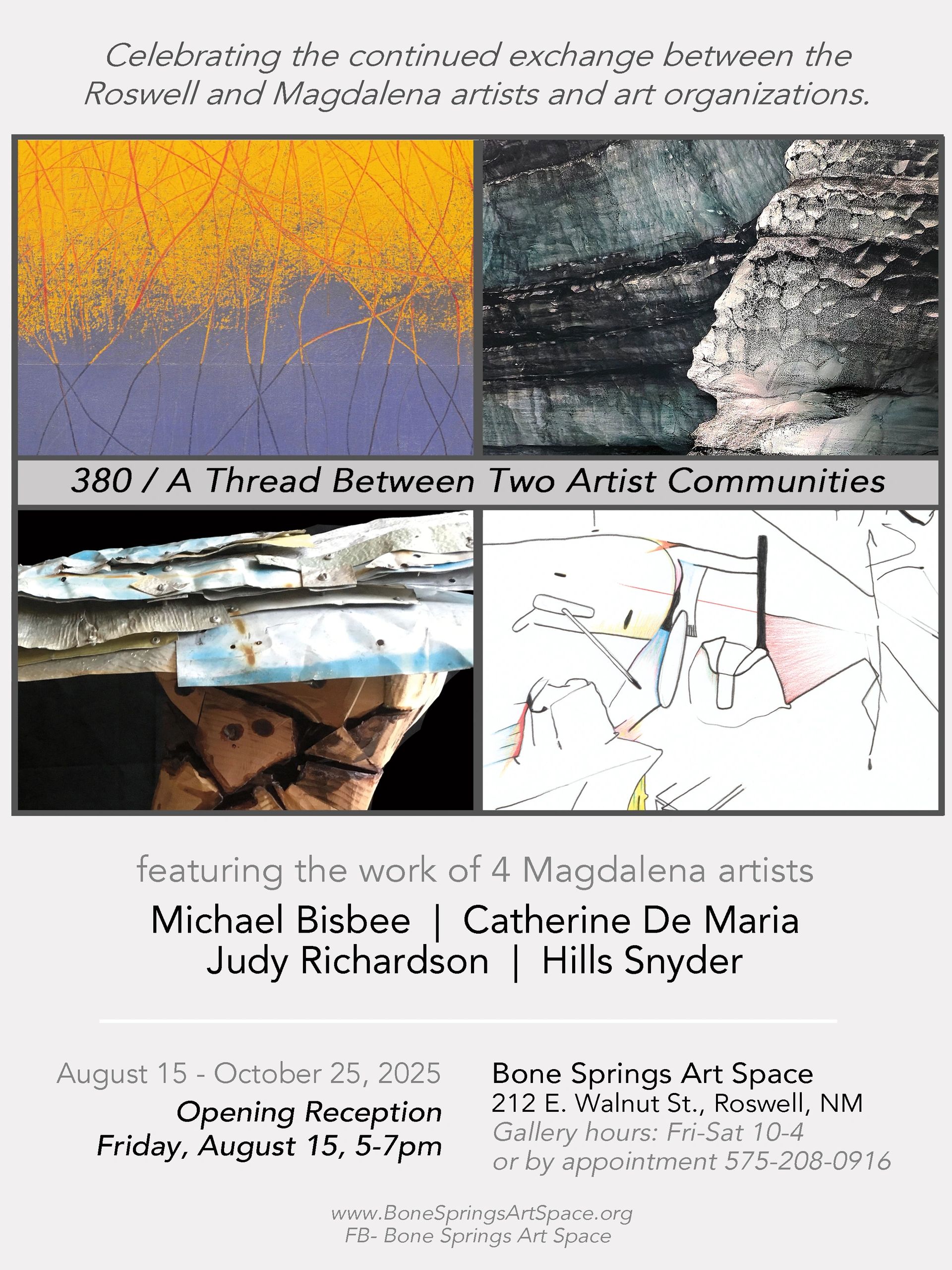 In celebration of the ongoing support between the Roswell and Magdalena, NM art communities, Bone Springs Art Space is pleased to host 4 Magdalena artists - Michael Bisbee, Catherine De Maria, Judy Richardson and Hills Snyder.